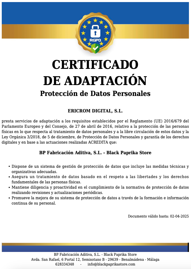 BP FABRICACIÓN ADITIVA, S.L. CIF/NIF B-44609469 con domicilio en Avda. San Rafael 6 Portal 12, Semisótano B, 29631 Benalmádena (Málaga) y correo electrónico de comunicaciones INFO@BLACKPAPRIKASTORE.COM.